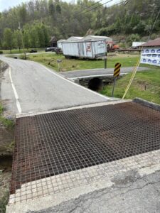 Barricades have been placed at each end of the structure to prevent traffic flow. Motorists can use US 460 and KY 40 through Oil Spings as alternate routes. The roadway, KY 580, connects between KY 40 and US 460, and serves about 320 vehicles a day.
